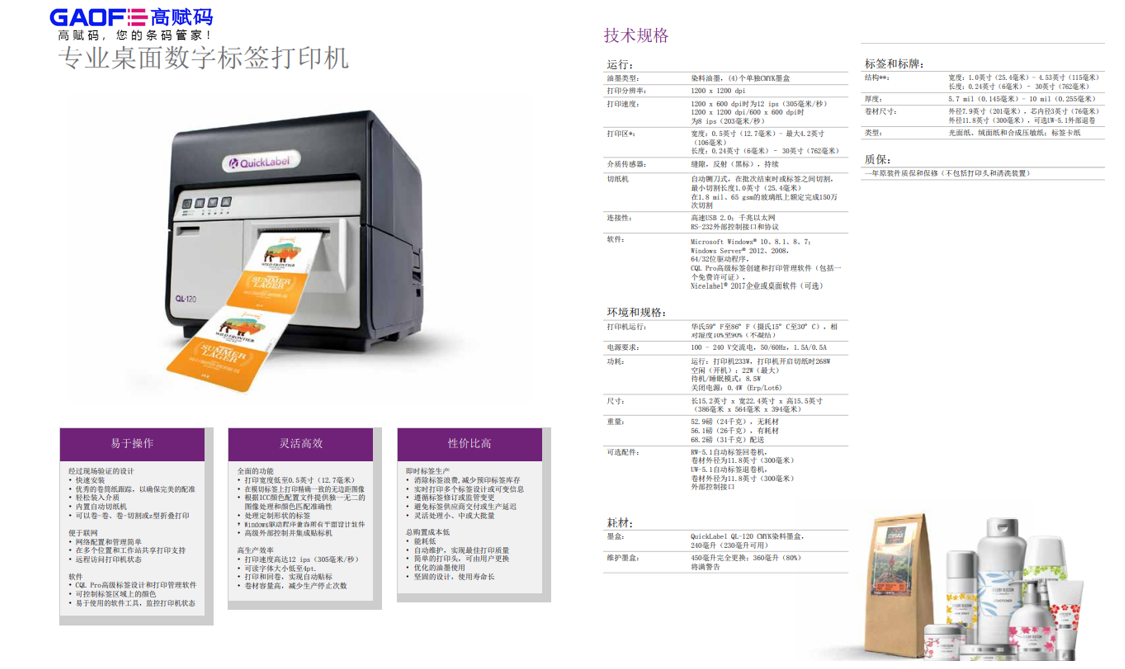 這是一款高效能的桌上型彩色標簽打印機,設計采用當今市場上先進的噴墨技術。利用其強大的數(shù)字彩色引擎,QL-120使人們能夠打印自己的彩色標簽,與從商用標簽打印公司購買過多的預打印標簽相比,這款彩標打印機更能省錢省時。QL-120 設計集高速、生動的顏色、高分辨率和易用的高質量輸出于一體。憑借其小巧的尺寸,它可輕松安置于您的辦公桌或桌面上。QL-120 僅用一個打印頭就能夠打印窄幅和寬幅標簽,非常適用于以低成本小批量自定義您的產品標簽。當客戶使用 QL-120 在辦公室或工廠打印標簽時,可以擺脫庫存過剩和生產延遲,實現(xiàn)精益的單件流生產流程。作為可用的速度快、功能全面的內部數(shù)字彩色標簽打印機,QL-120 能夠以數(shù)字方式準時打印準確數(shù)量的正確標簽,在提高靈活性的同時節(jié)省成本??尚∨枯p松打印包含任何文本、條碼或彩色圖形的標簽,非常適用于為多種不同產品貼標或為不同批發(fā)客戶貼標。