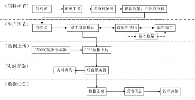 確認(rèn)每個(gè)工位上的員工卡;記錄員工領(lǐng)取原料數(shù)量及相關(guān)信息;使用手持機(jī)記錄領(lǐng)取人和物料條碼;員工結(jié)束原料加工后,開(kāi)始第二次原料領(lǐng)取前,再讀取此原料條碼以示結(jié)束;進(jìn)入下一道工序。